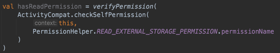 잠시 이 메소드의 소스코드를 보겠습니다. 컨텍스트와 퍼미션을 인자로 받아서, 퍼미션이 존재하는지 확인하는 군요.