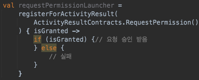 아래와 같이 registerForActivityResult 함수를 이용해서 권한을 요청하는 launcher를 정의해 줍니다.