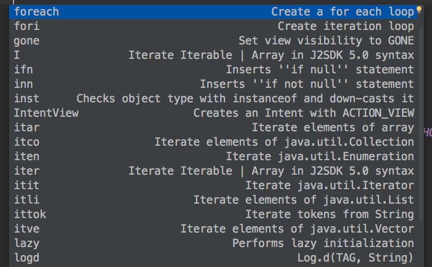 아래 이미지 보시면 알 수 있듯이, foreach 문 자동완성부터, logd로 log 남기는 템플릿 완성코드도 있네요.