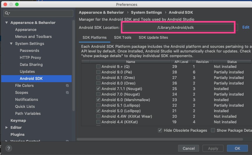 아래에서 볼 수 있듯이, Android SDK Location의 위치가 나옵니다.
