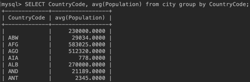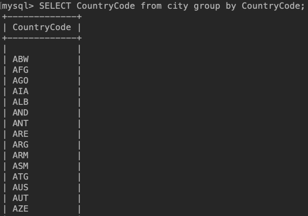 아래는 city테이블의 데이터들을 CountryCode로 국가별로만 그룹핑해서 조회한 것 입니다.