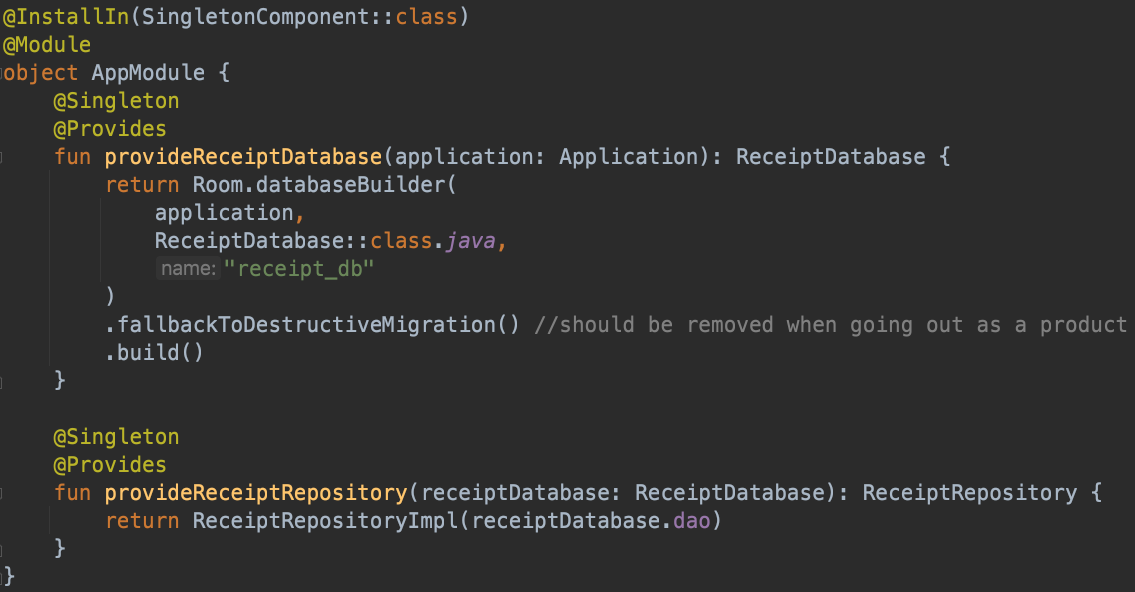 아래와 같이 Module을 만들어서, Database의 객체를 생성하는 방법을 Provides Annotation을 이용해서 Hilt에게 알려주기만 하면 됩니다.