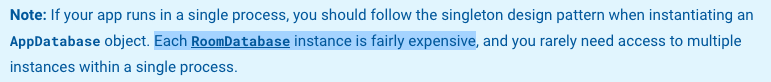 RoomDatabase 객체를 만드는 것이 비싼 작업이므로,