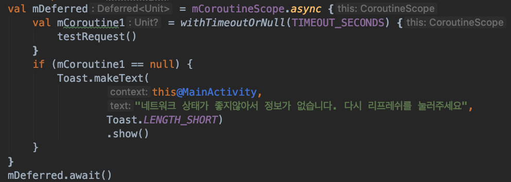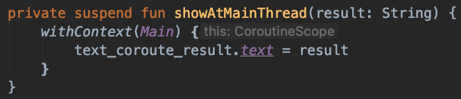 Coroutine의 스코프에서 사용되어 지는 함수는 suspend라는 키워드를 아래와 같이 붙여 주어야 합니다.