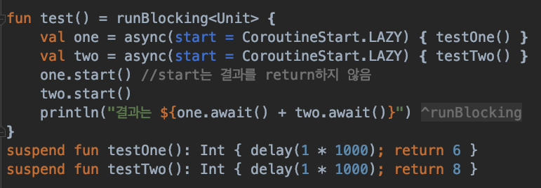 launch나 async함수에 인자로 "start = CoroutineStart.LAZY" 를 아래와 같이 넣어주면 됩니다.