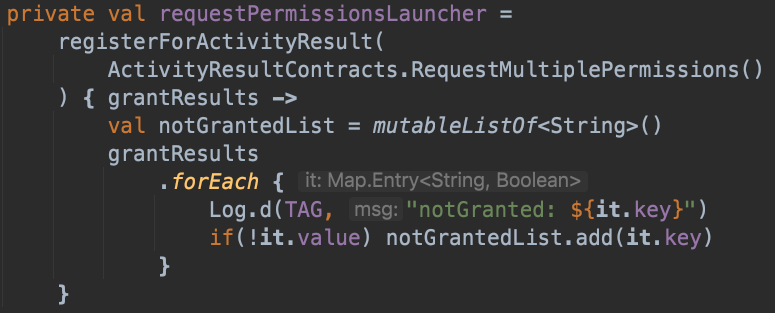 아래와 같이 registerForActivityResult 함수를 이용해서 권한을 요청하는 launcher를 정의해 줍니다.