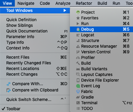 메뉴에서 View > Tool Windows > Debug를 선택해 주어도 됩니다.