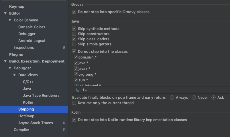 Do not step into the classes에 대한 옵션이 오른 쪽에 보입니다.