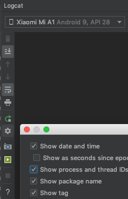 로그캣의 좌측에 보면 톱니바퀴모양의 설정 아이콘이 있습니다.