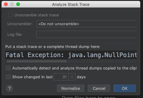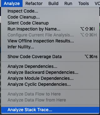 안드로이드 스튜디오의 Analyze > Analyze Stack Track로 이동합니다.