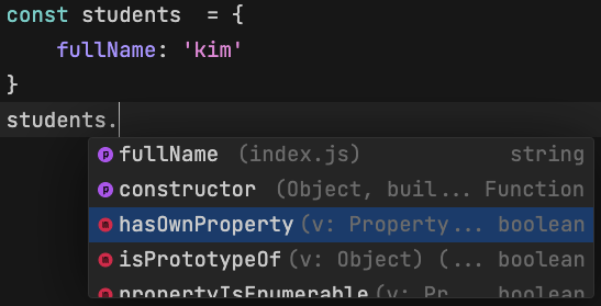 'students.' 이라고 입력하면, 본적없는 속성들이 IDE에 아래와 같이 나열되는 것을 볼 수 있습니다.