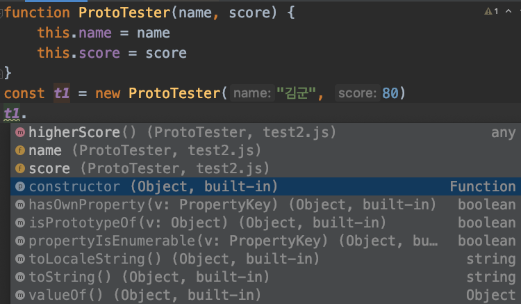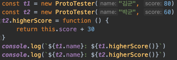 t2의 경우, 객체에 새롭게 higherScore라는 Property를 정의했으므로, prototype으로 찾아올라가지 않고,