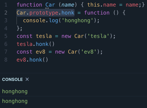 "tesla"객체의 부모인 Car.prototype 에 honk라는 함수를 추가시켜주었는데요.