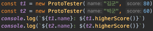 t2 객체에서도 higerScore()를 실행시켜서, 10점이 올라간 90점과 70점의 결과값을 얻을 수 있습니다.
