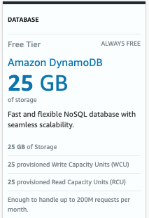 25GB의 용량제한과 RCU와 WCU각각 25Unit으로 제한되는데요.