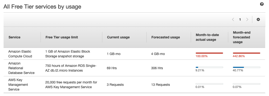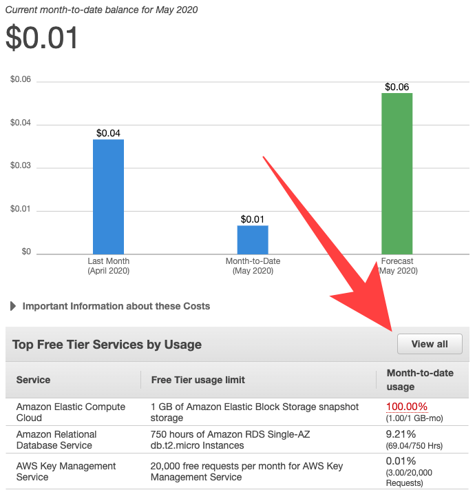 화살표가 가리키는 Free Tier usage limit과 Month-to-date actual usage를 비교해가며,