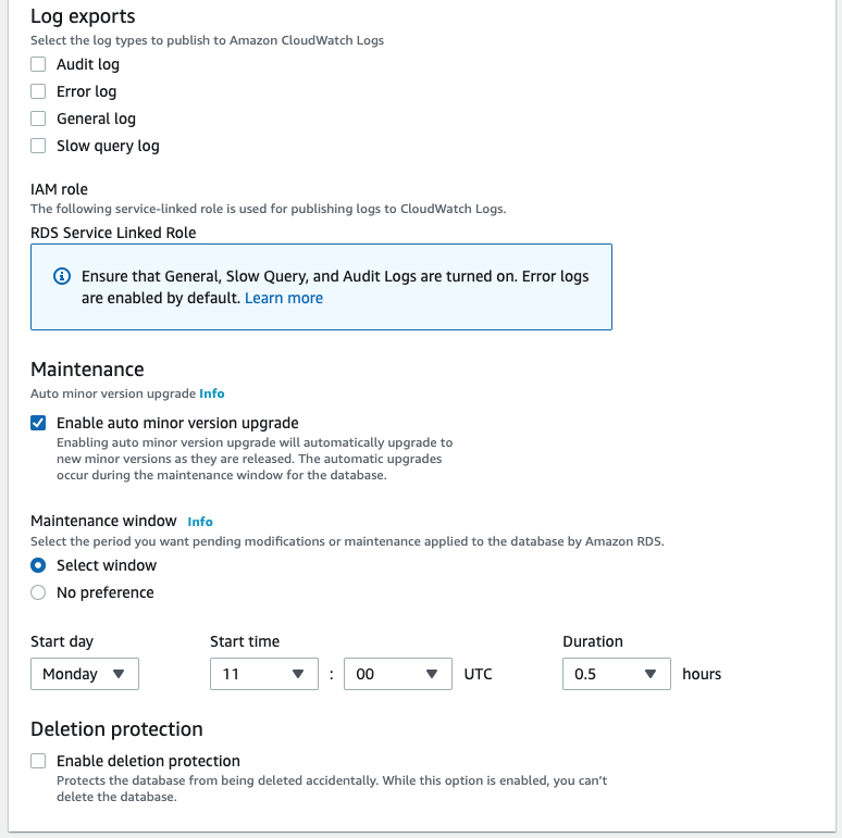 하단의 Deletion protection 은 인스턴스 삭제가 되지 않도록 하는 것인데요.
