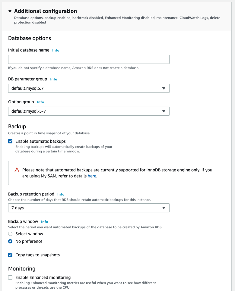 RDS를 실제로 Production에서 사용할 때는 Enable automatic backups가 활성화 되어 있어야 하겠지만,