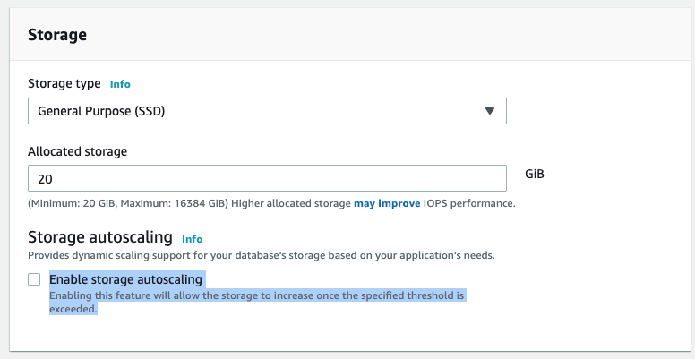 한가지 주의할 것은, 아래의 Enable storage autoscaling의 경우,