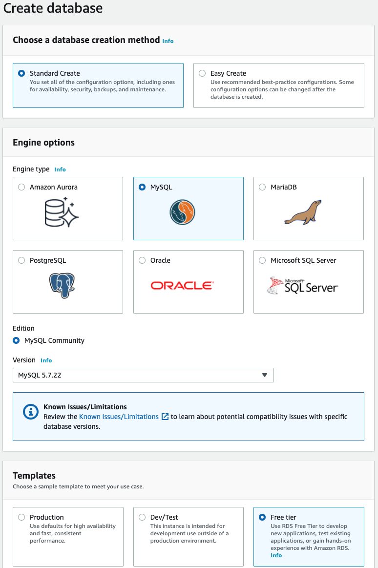 그러면, AWS에서 제공할 수 있는, 데이터베이스 서버 엔진의 종류와 옵션을 선택하라고 나옵니다.