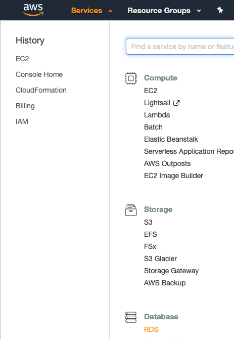 먼저 콘솔화면에서 아래와 같이 Services > Database > RDS를 선택해 줍니다.