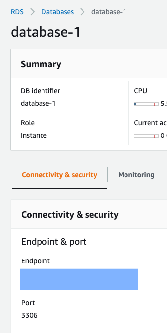 하단 탭의 Connectivity & security에서 Endpoint가 RDS에 접속하는 주소를 가르킵니다.