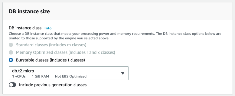 Free Tier는 db.t2.micro만 사용할 수 있습니다.