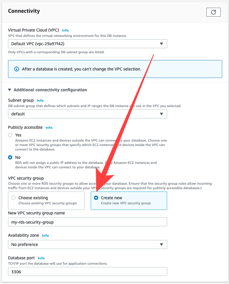 VPC security group의 경우, Create new를 선택해서 새롭게 설정해 줍니다.