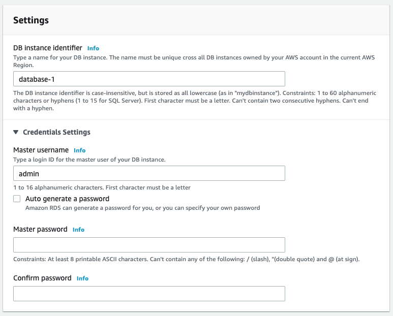 첫번째로 나오는 instance identifier는 생성하는 RDS 서버의 이름인데요.