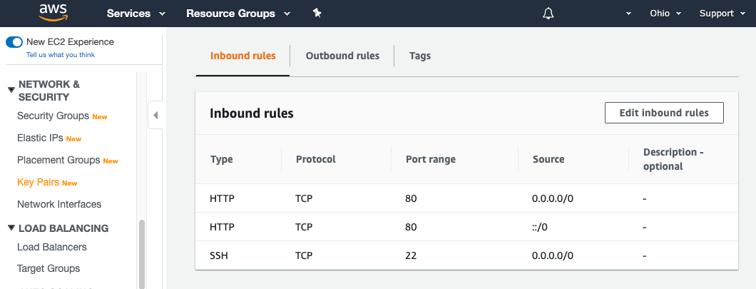 아래와 같이, 나오는 화면의 우측상단의 edit Inbound rulse를 클릭해 줍니다.