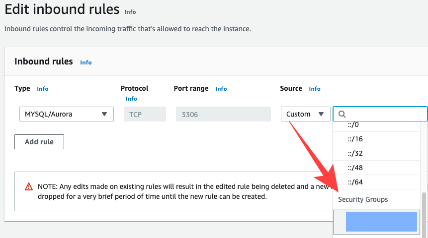 Type은 MYSQL그리고, Source를 Security Groups중 EC2의 보안그룹을 선택해 줍니다.