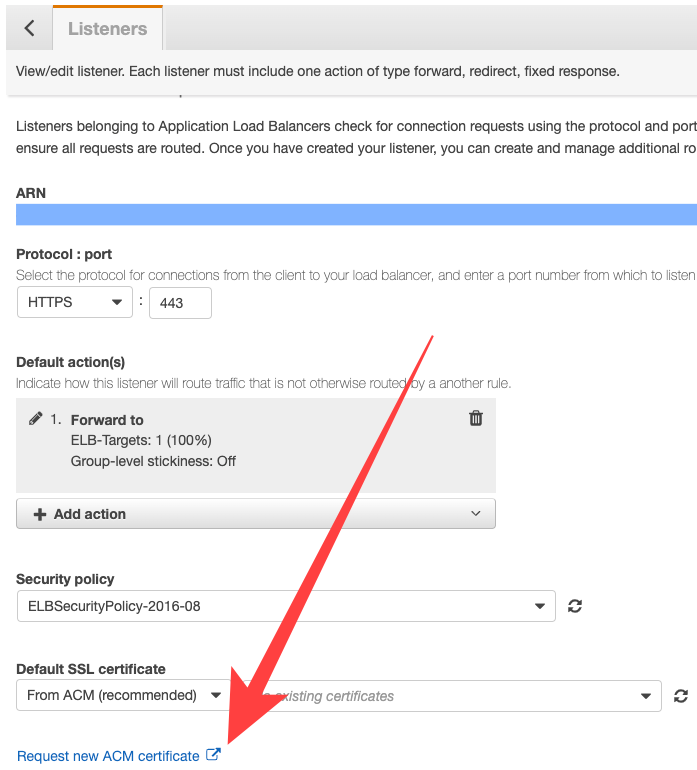 위에서 ELB의 Listener를 설정하던 화면에서 ACM을 통해 생성된 Certificate을 선택해 준 후에,