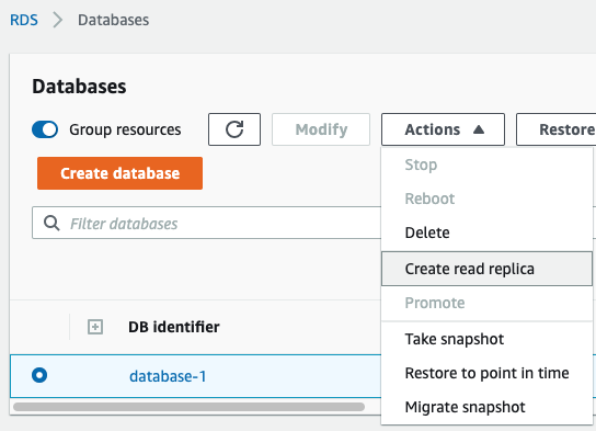 먼저 Service > RDS에서 Master로 사용할(복제할) 서버를 선택합니다.