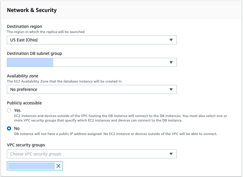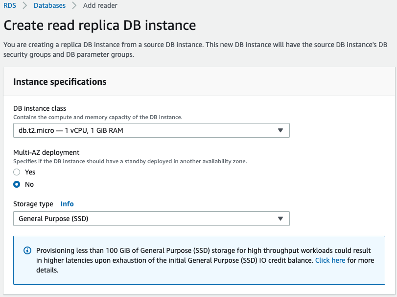Read Replica Source는 복제할 대상, 즉 Master를 선택해 주는 것이구요.