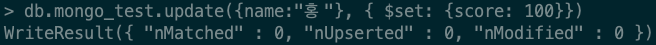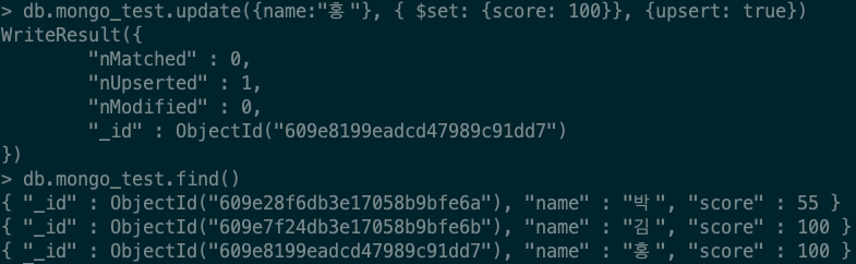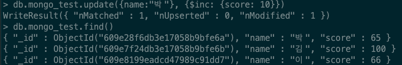 db.mongo_test.update({name:"박"}, {$inc: {score: 10}}, {upsert: true})