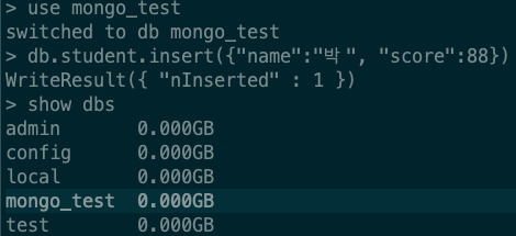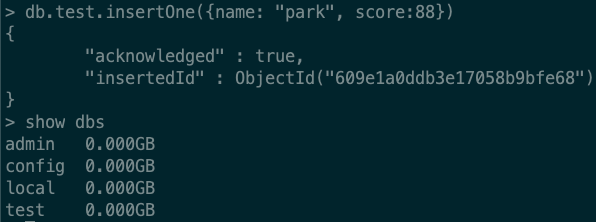 아래와 같이 insertOne()명령어를 이용해 document를 입력해 주면 아래와 같이, test db가 리스팅된 것을 알 수 있습니다.