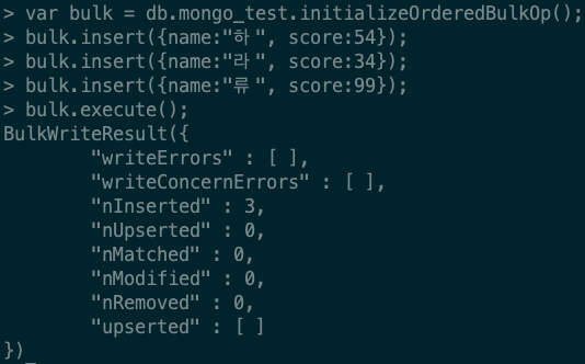 MongoDB에는 한번에 여러개의 연산을 모아서 할 수 있는 Bulk연산을 할 수 있습니다.