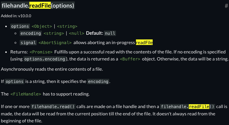 아래는 비동기적으로 파이전체를 읽어들이는 readFile() API에 대한 공식 문서설명입니다.