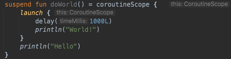 코루틴 빌더인 launch 블록안에 delay등의 코루틴 코드가 있는 것을 볼 수 있습니다.