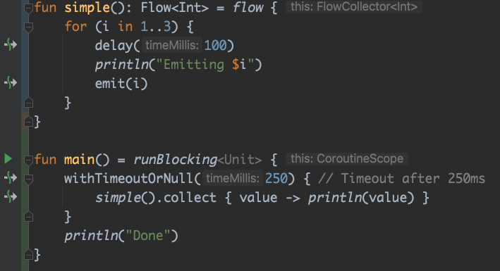 아래코드는 stream을 소비하는 withTimeoutOrNull()함수가 250ms뒤에 timeout을 하게 됩니다.