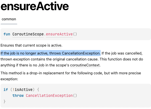 isActive가 false로 나오면 CancellationException을 throw 해서, Coroutine을 cancel 시킵니다.