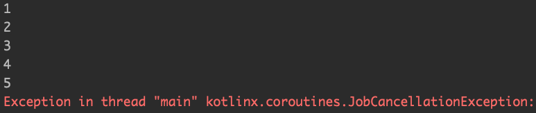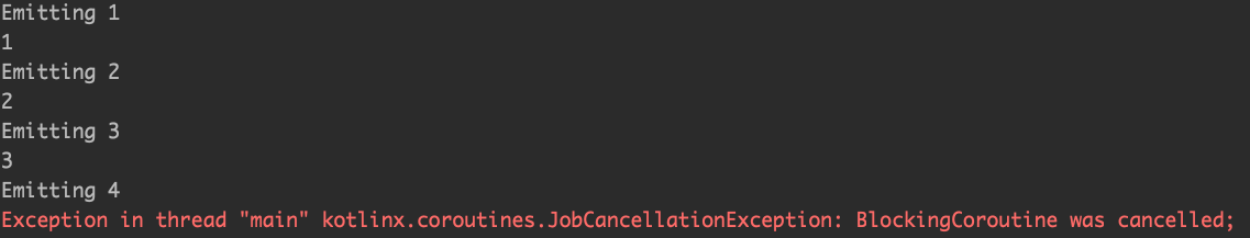4를 흘려보내다가, cancellationException이 전파되어서, 아래와 같이 Exception이 나게 되는 것을 볼 수 있습니다.