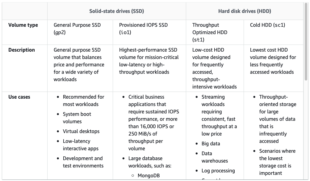 최적의 디스크를 선택하기 위해서 EBS의 타입이나 사용방법에 대해서 알아두는 것이 좋을 것 같습니다.