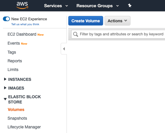 먼저 AWS콘솔에서 EC2 > Elastic Block Store > Volumes 를 선택해 줍니다.