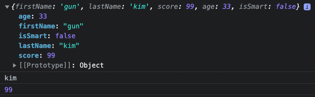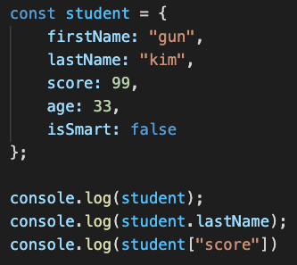 생성한 object의 property에는 아래와 같이 "." 또는 "[]"를 이용해 접근할 수 있습니다.