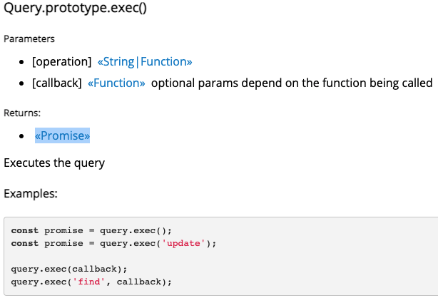 Query의 API를 사용할 경우, return타입은 Query입니다. Promise타입으로 반환하고 싶다면, execute()를 사용해 주어야 하겠지요.