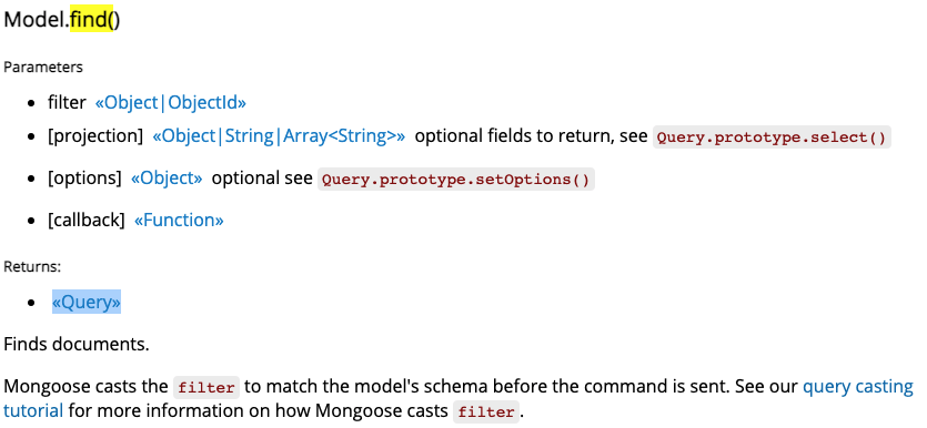 MongoDB에서 직접 사용하는 Query문의 형태가 아니라, Mongoose API의 함수들을 이용하게 됩니다.