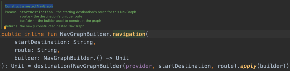 NavGraphBuilder의 확장함수인 NavGraphBuilder.navigation() 함수입니다.