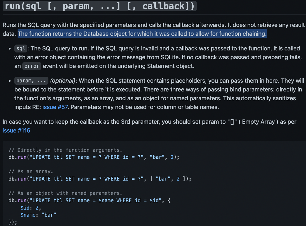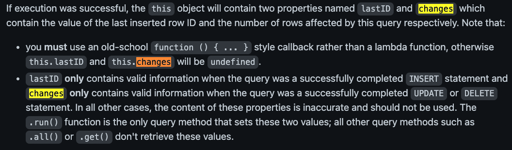 위에서도 보았지만, run()함수는 성공하게 되면, lastId와 changes라는 프로퍼티를 가지는데요.
