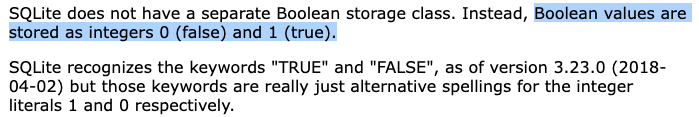 다행히도 SQLite 3.23.0 버전부터는 'TRUE'와 'FALSE'라는 키워드를 인식하게 되었습니다.
